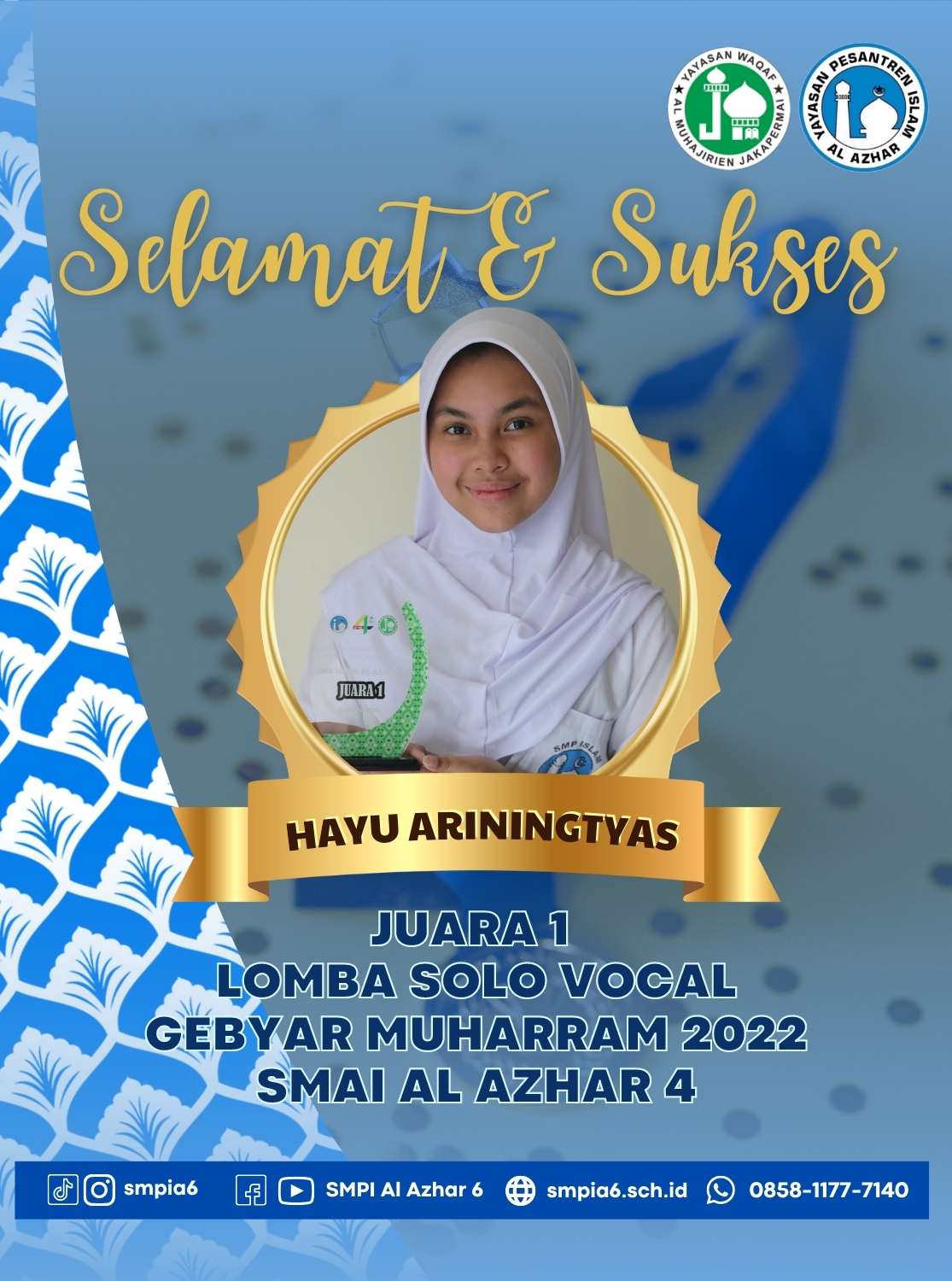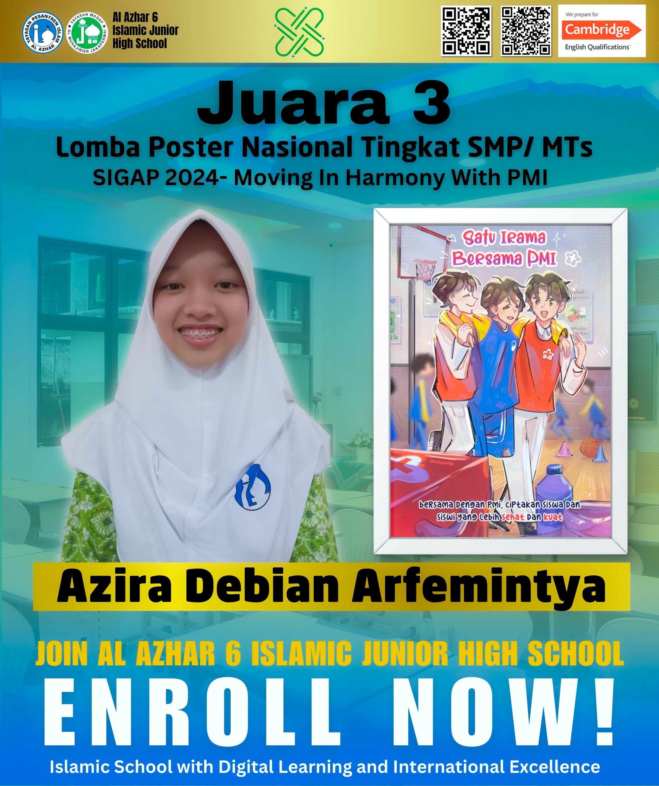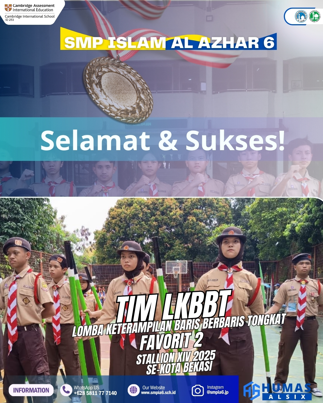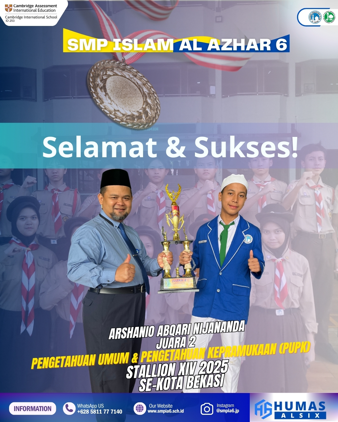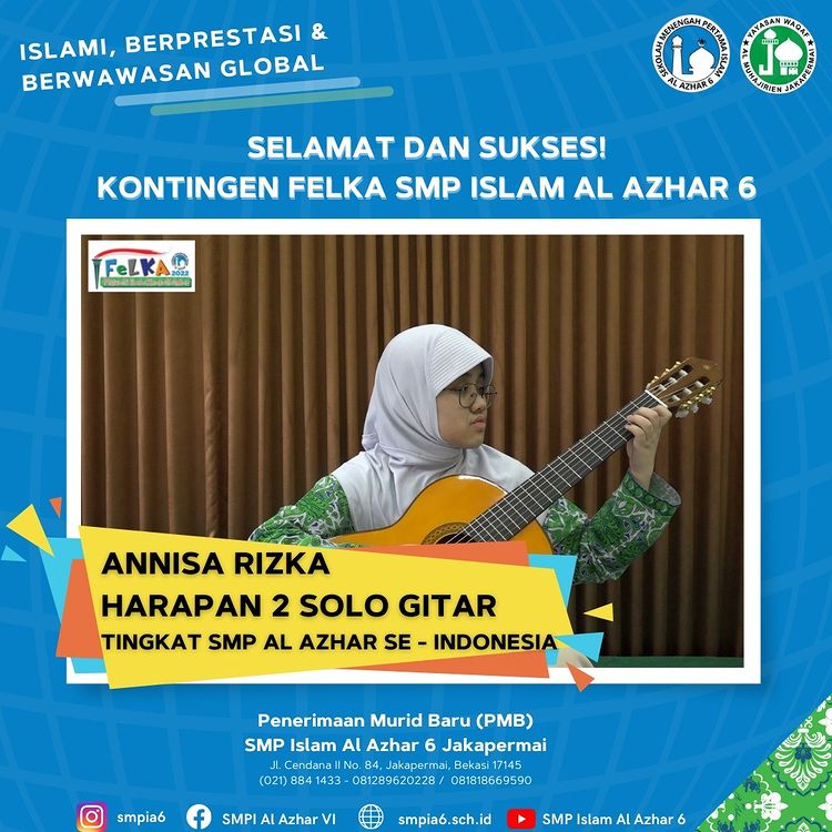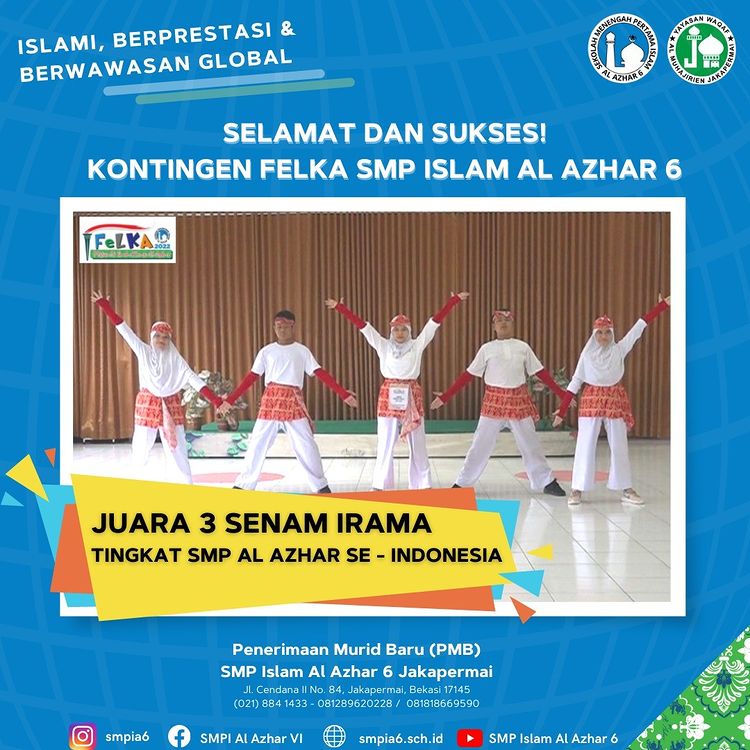Bismillaah, SMP Islam Al-Azhar 6 Jakapermai merupakan sekolah kebanggaan saya. Di sana saya belajar bahwa hal yang terpenting bukan hanya pengetahuan kognitif saja, melainkan cara untuk menjadi pribadi taat beragama serta menghormati orang dan lingkungan sekitar saya.