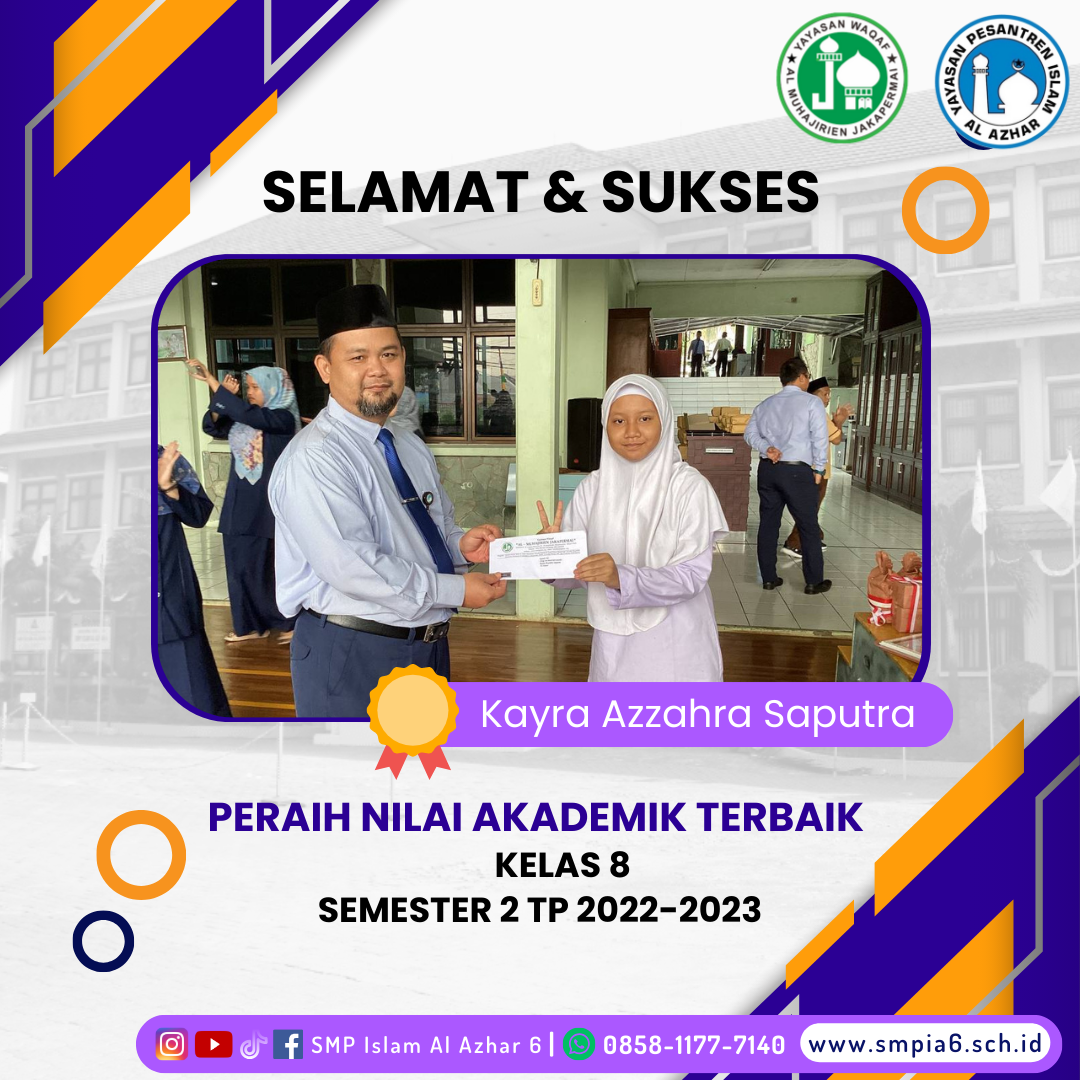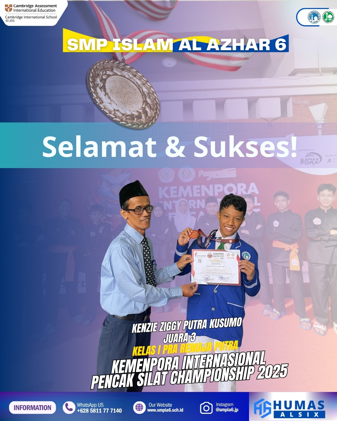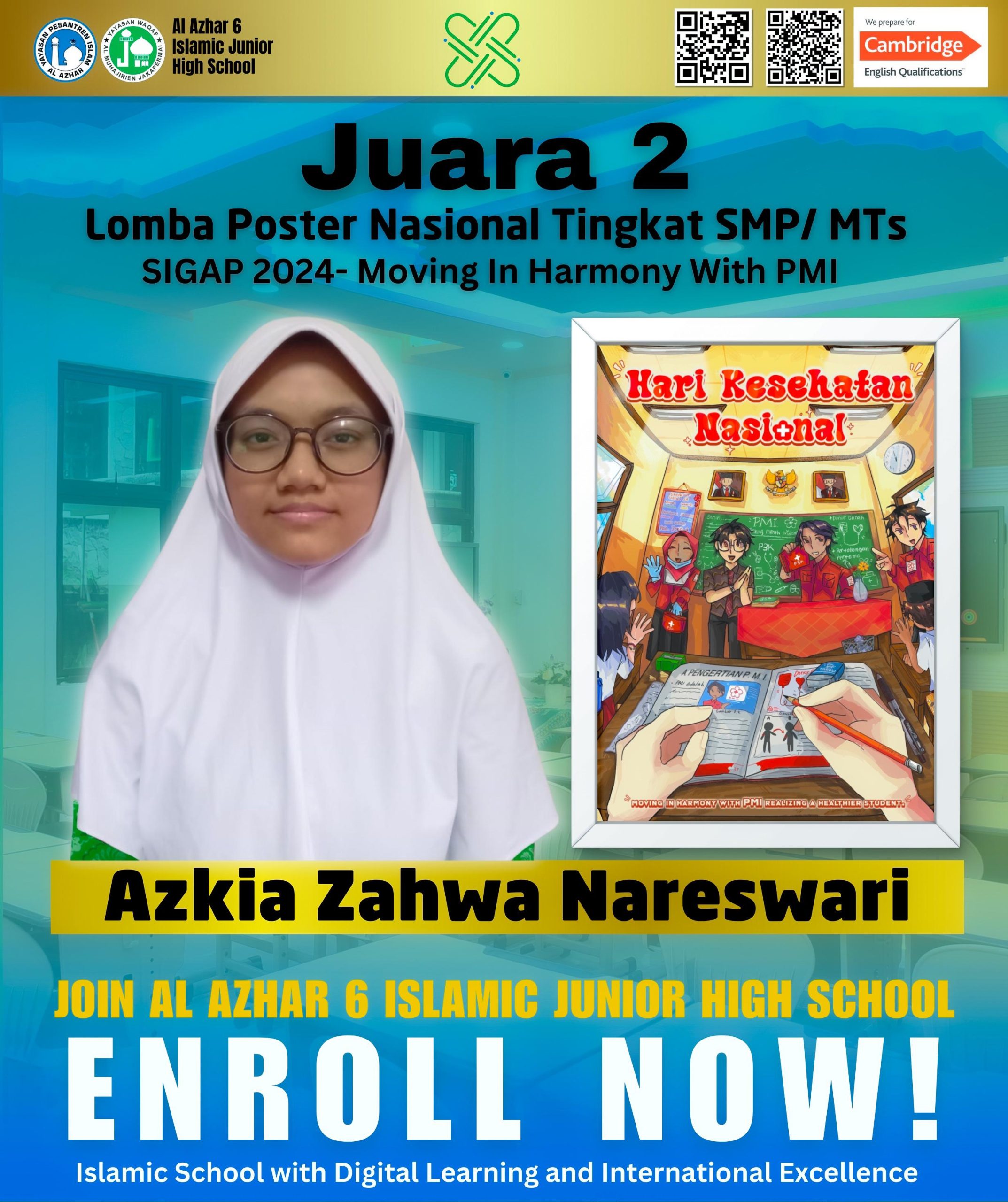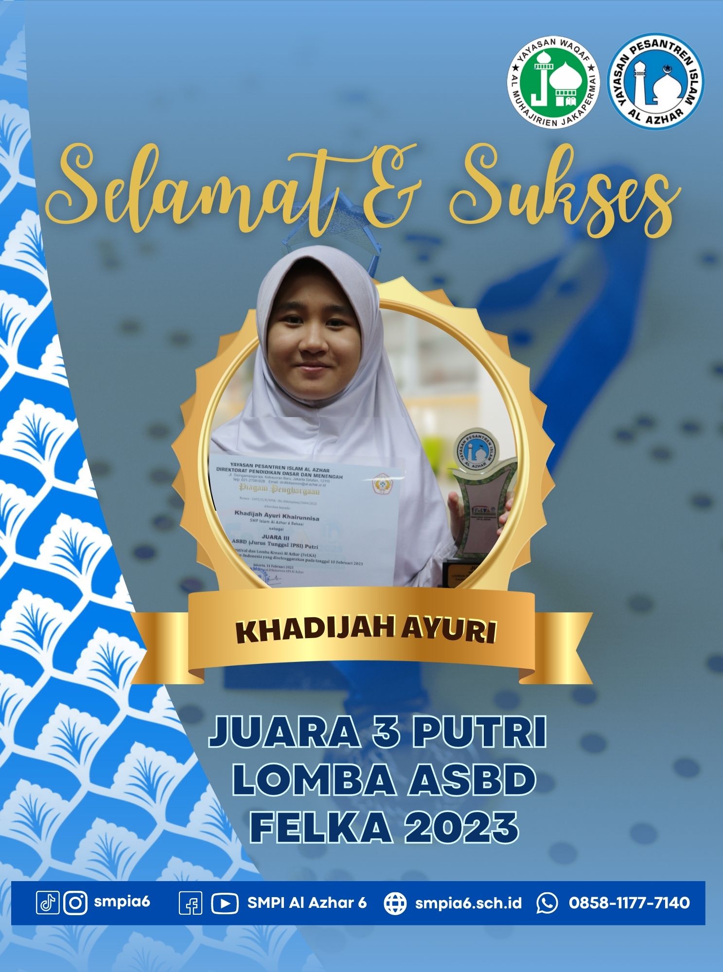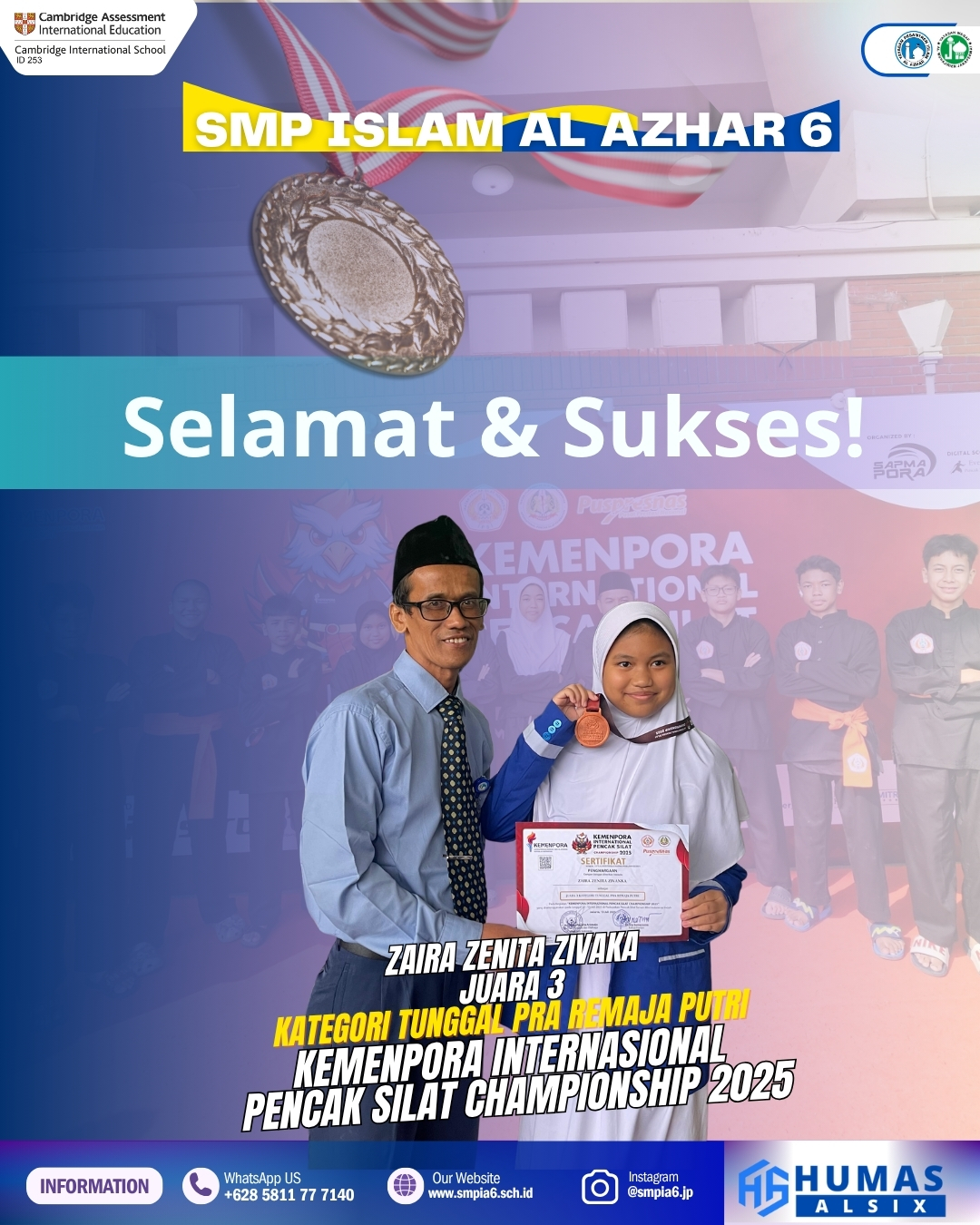 Bismillaah, SMP Islam Al-Azhar 6 Jakapermai merupakan sekolah kebanggaan saya. Di sana saya belajar bahwa hal yang terpenting bukan hanya pengetahuan kognitif saja, melainkan cara untuk menjadi pribadi taat beragama serta menghormati orang dan lingkungan sekitar saya.