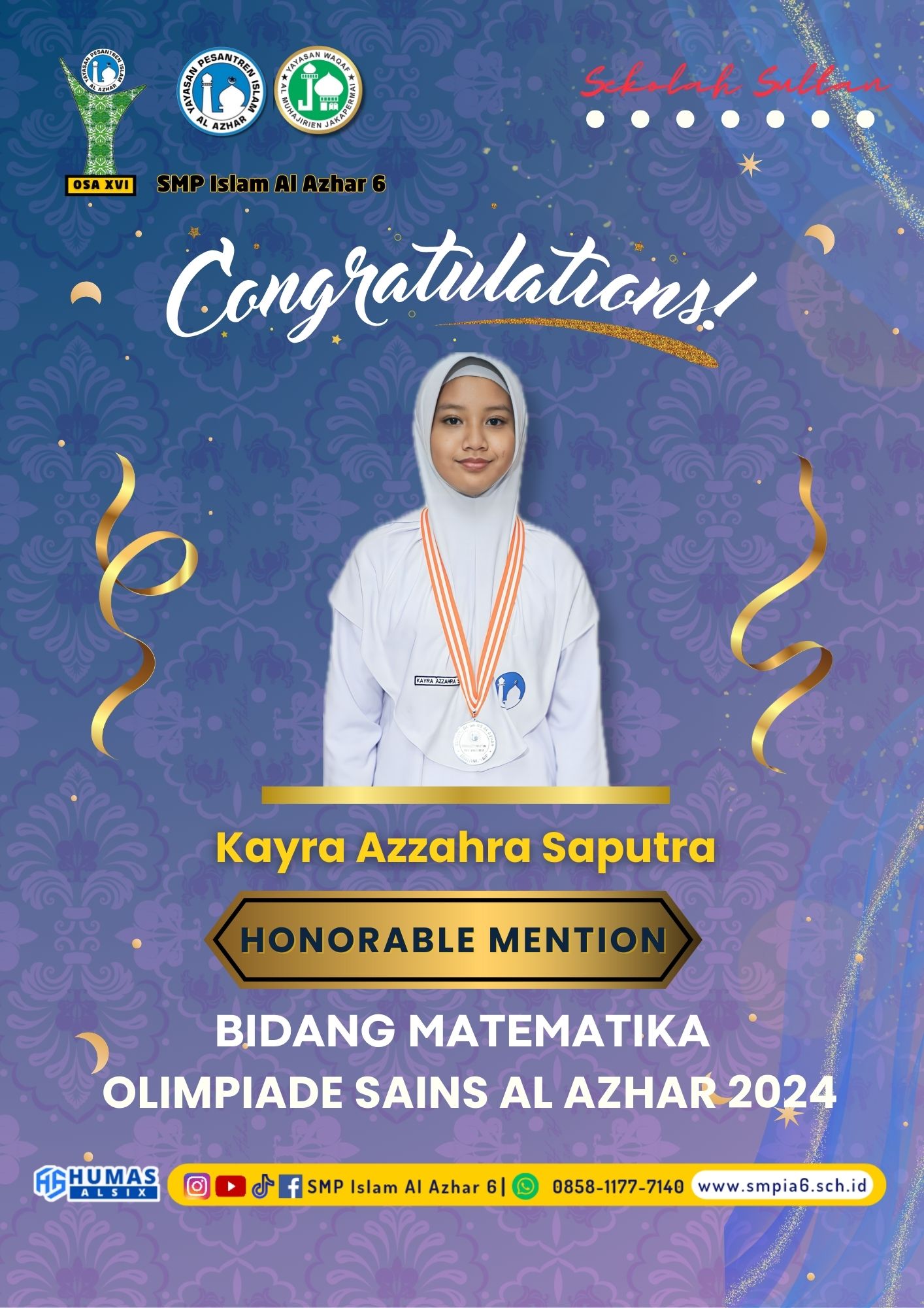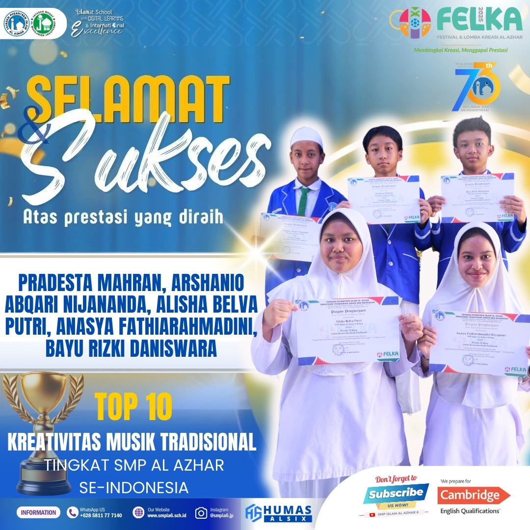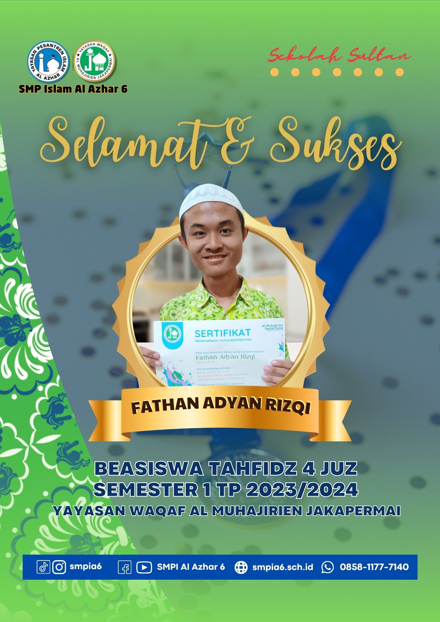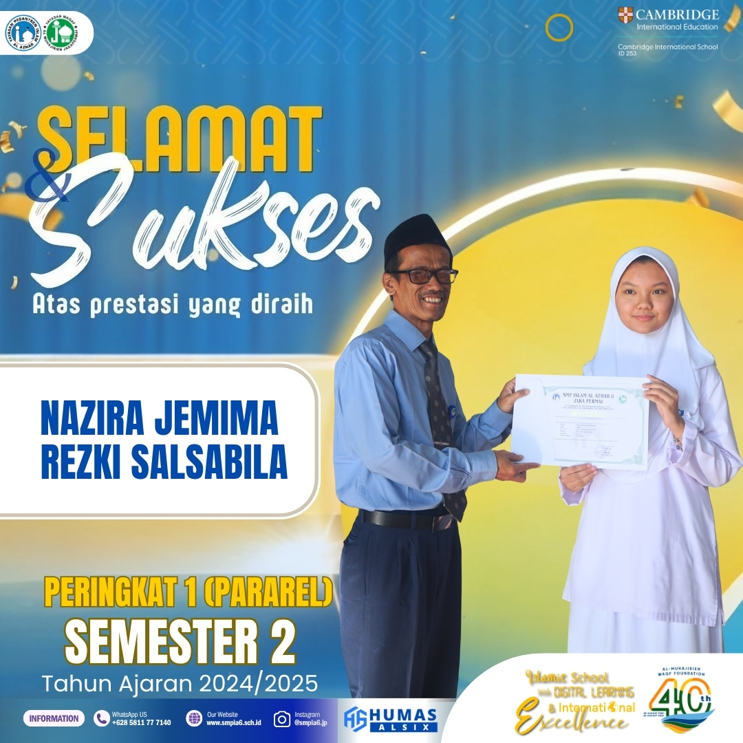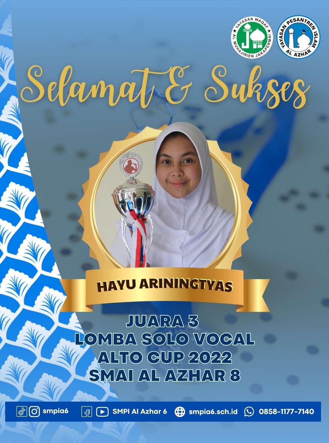 Bismillaah, SMP Islam Al-Azhar 6 Jakapermai merupakan sekolah kebanggaan saya. Di sana saya belajar bahwa hal yang terpenting bukan hanya pengetahuan kognitif saja, melainkan cara untuk menjadi pribadi taat beragama serta menghormati orang dan lingkungan sekitar saya.